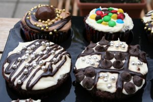 After 7 years of painstakingly making animal or vehicle-shaped fondant covered cakes (I have made at least 12), I tore myself from tradition and decided on cupcakes instead. They didn’t take any less time, but they’re easily stored (I love my dinky cupcake transporter) and easily moved around. And they come in their own neat, biodegradable, single-serve packaging.