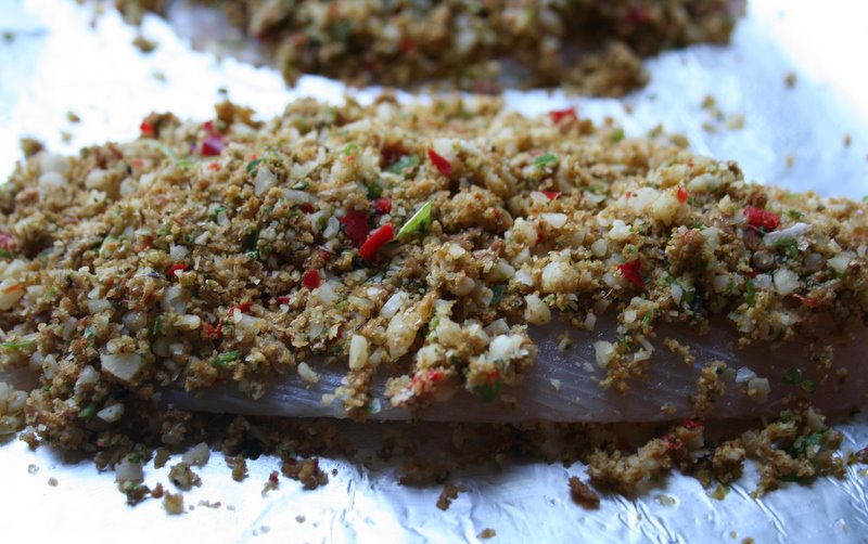 3. Spread crumbly topping over the fish generously