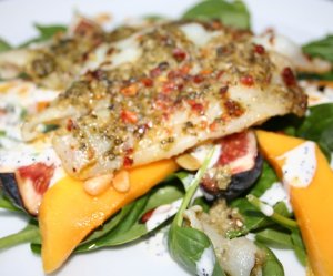 This amount will be sufficient for two portions. Served here with fig and mango salad.