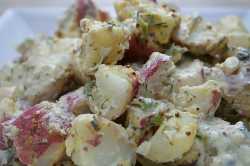 - Stir the creamy dressing into the hot, cubed potatoes gently, taking care not to break them up