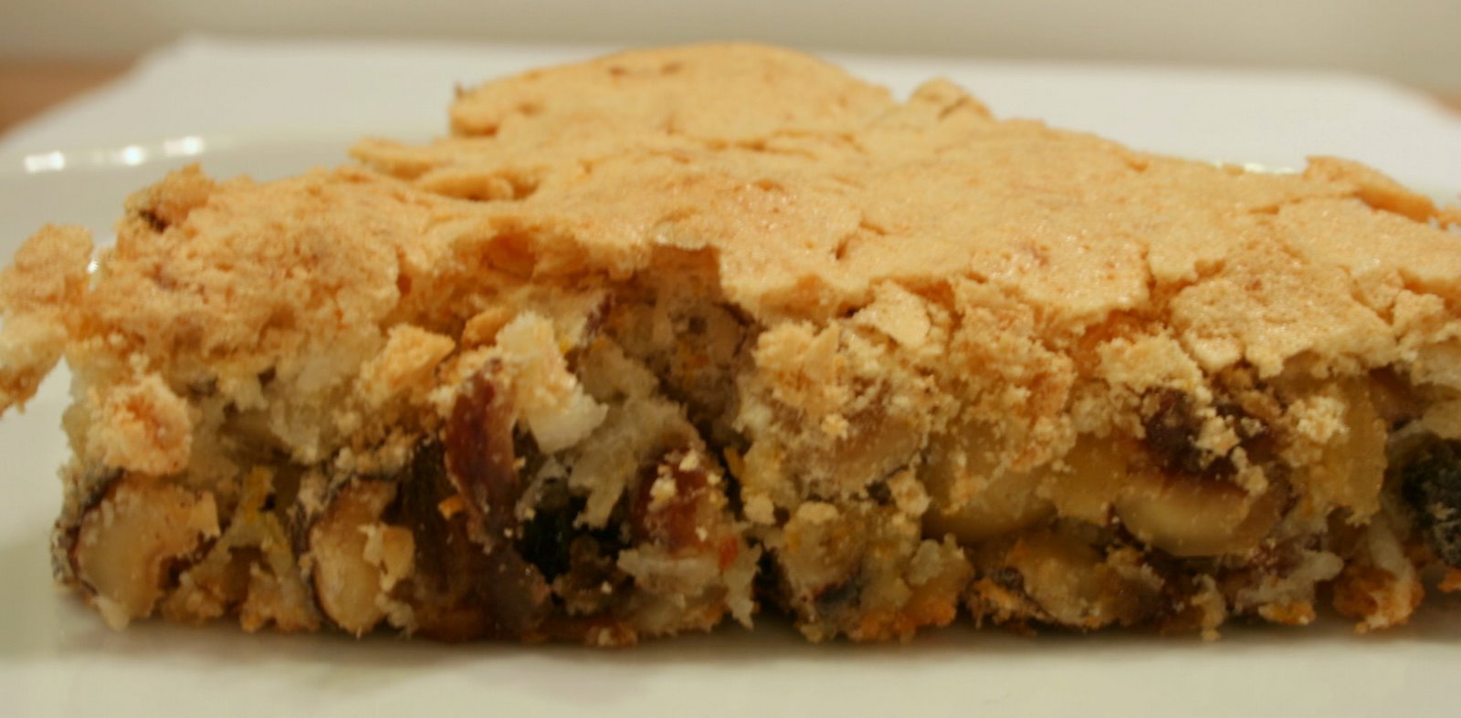 One of the appealing things about a meringue, apart from how it miraculously transforms from an unremarkable, gooey liquid into a fluffy, glossy cloud of loveliness, is the fact that you could – just about – throw anything into it and produce a delicious cake. This one has ground almonds and dates in it, crystallized ginger, orange peel, macadamia and walnuts. Perfect for a Passover dessert really, since it’s void of any flour and raising agents. It’s aromatic and its sweet, sticky fruitiness will guarantee its swift disappearance.