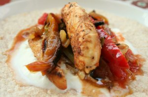 - Toast a wholewheat wrap on a heated pan, slather it with some sour cream or thick yoghurt and bung the chicken and grilled peppers and onions on top