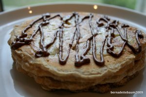 - Ladle a scoop onto your Pam-ed pancake pan and sprinkle with chocolate chips or banana slices. Chocolate goes beautifully with the oranginess of this pancake, but the yummy pancakes didn’t make as picturesque a photo 🙂