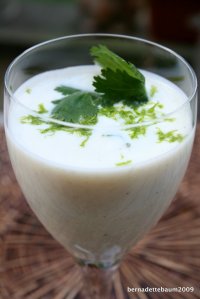 Summer’s finally here – a bit unusual to be saying this in mid-July but the weather’s been a bit dicey with the relentless monsoon rains we’ve had recently (note the vibrant green of the lawn). Yogurt, a staple in our fridge, is the star here in lassi, a beverage made of yogurt, presented sweet or savoury. The latter may not suit the uninitiated but I find it very refreshing.