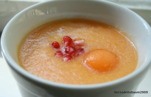 So I copped out on the chicken soup and matzo balls this year. What can I say, it’s a recession and I couldn’t countenance wasting an entire carcass for what would have been, no doubt, a tasty soup. Besides, the butcher was long on non-kosher sausages and short on chicken bones. Instead, I reproduced a soup I came up with a few weeks earlier when I found myself with two voluptuous melons fast ripening and fast stinking up my kitchen – this is what melons do if you haven’t room in your fridge for them – and had to find a non-wasteful way of using them up.