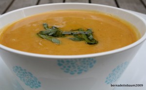 Fast forward five years, in tribute to those memorable days, to the season’s bounty of fruit and squash, and to the fact that both children are still good eaters, here’s that puree again, reincarnated as a rich and nutty soup for the family, flavored with apple and aromatic spices.