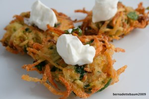 The chilli latkes vanished speedily the last time I made them, even in the mouths of babes aged 2 and 4. These ginger and cilantro ones are similar, and in a second batch, I added one grated zucchini too, which made no difference to the taste but definitely helped the conscience 😉 In a food processor, add the onion, about an inch of fresh ginger, four garlic cloves, give it a whizz, then turn it into a pan and saute till fragrant. Add that to the grated potato, with or without zucchini, with a massive handful of chopped cilantro. I added a tablespoon of cornmeal for crunch, don’t forget the other ingredients. Serve with sour cream, or applesauce, or a sweet chilli sauce (the latter would have been the clear winner with the Maccabees, I assure you).