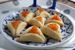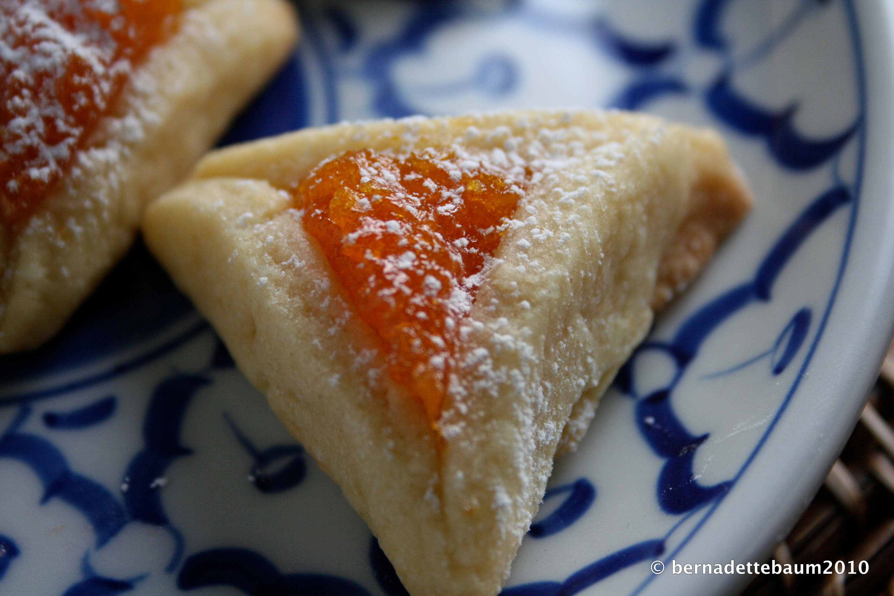 No matter. I still had 20 beautiful apricot ones! With the two-third of pastry still left in the fridge, I made another 40 hamantaschen the next day, with both apricot and a homemade prune filling (for that, simmer a few handfuls of prunes with 2 tbsp of blackberry jam, 1/3 cup hot water and some lemon or orange zest till the prunes are tender. Add a little sugar if needed, then process, cool and fill those pastries!