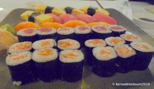 Though Zagat doesn’t rate this restaurant too highly, it looked modern and interesting, so we went in. Well, we were gobsmacked by the quality (and quantity) of the food, served in a smart, canteen-like setting (see slideshow), all in white and lime green. We had Happy Hour half-price sushi to start, half of which Mr Greedy Guts speedily transferred to his own plate. He had also ordered miso soup and a General Tso chicken to share with his brother and I couldn’t wait to see how much of those he’d finish – a rather alarming amount, I have to say!