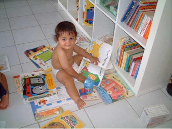The marvellous thing about my concerted efforts to fling books in his face was that, one beautiful day when he was 8 months old, the madness paid off. My son crawled independently to the bookshelf and picked out a book to sit and flip through – on his own!