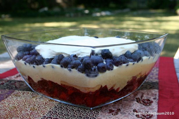 As for the trifles, I made two of these for Independence Day parties. Just layer up jelly (aka Jell-0) and strawberries, homemade vanilla-bean custard, blueberries and whipped cream. Dive in head first 🙂