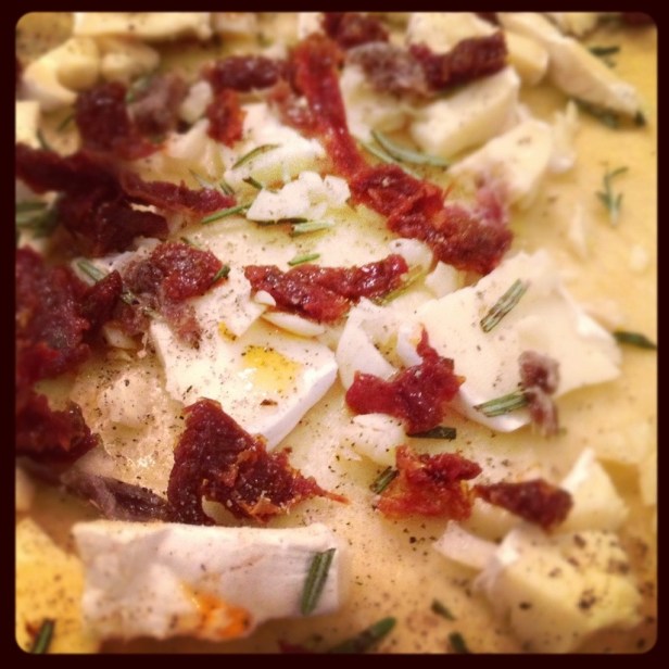 Here’s an easy focaccia you can mostly knead in your food processor (with a dough hook). I like to stuff half of it with herbs and cheese or vegetables and cheese to make half of a future meal with soup or salad. This focaccia was stuffed on one half with brie, rosemary, garlic, anchovies and sundried tomatoes.