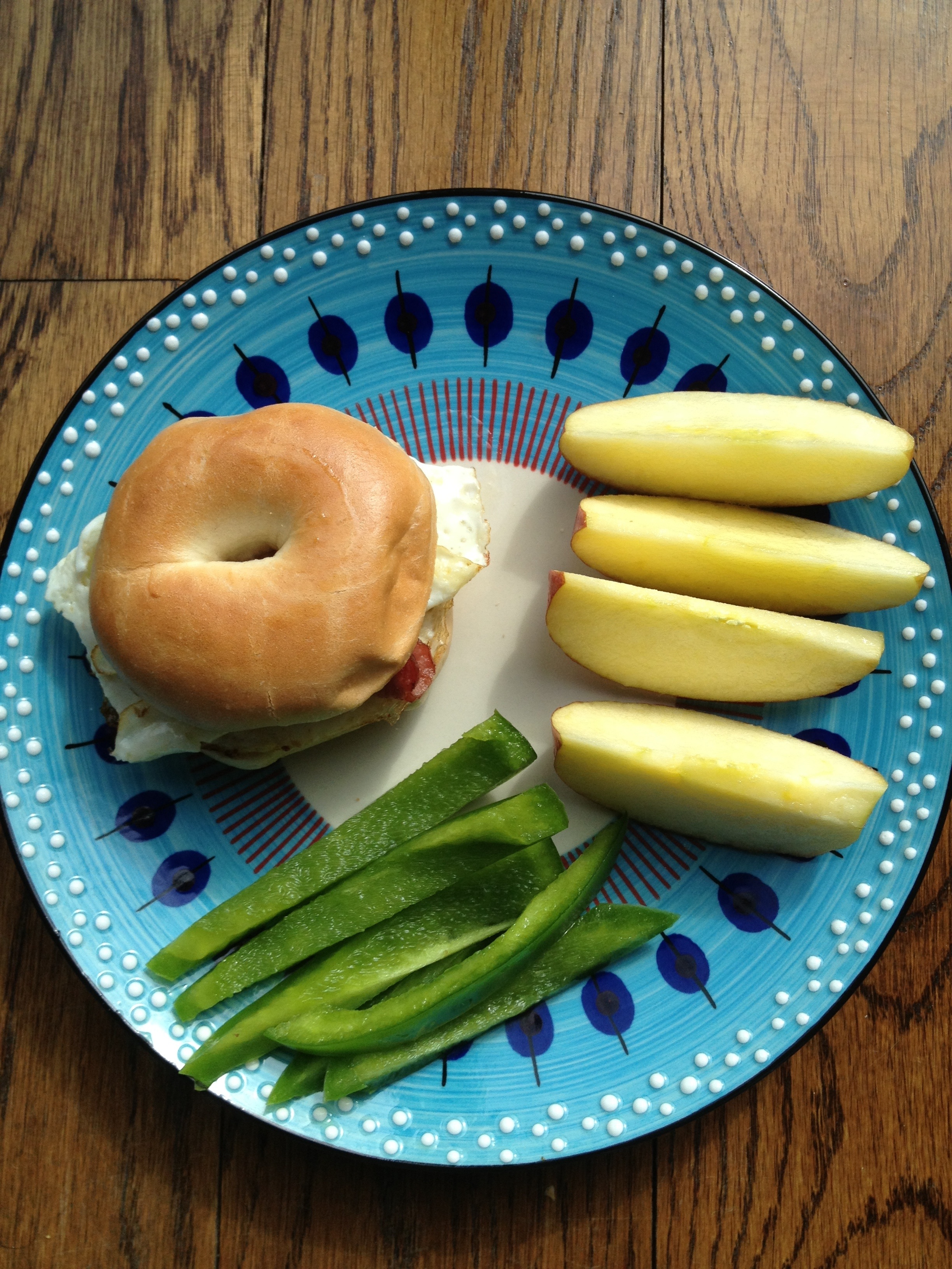 - a toasted mini bagel with egg white omelette and slice of turkey bacon, with green pepper and apple slices