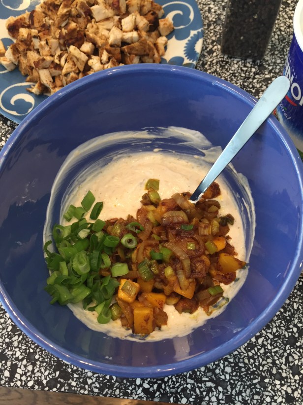 While I have cooked the chicken from scratch for my recipe below, just use leftover chicken if you’re pinched for time. (On a side note, who thought it’d be a great idea to serve leftover chicken slapped in two pieces of bread to a queen?!) This was absolutely delicious with a crisp salad and in a sandwich. It would also work with pasta. And, like many things imbued with spices, it tastes even better the next day!
