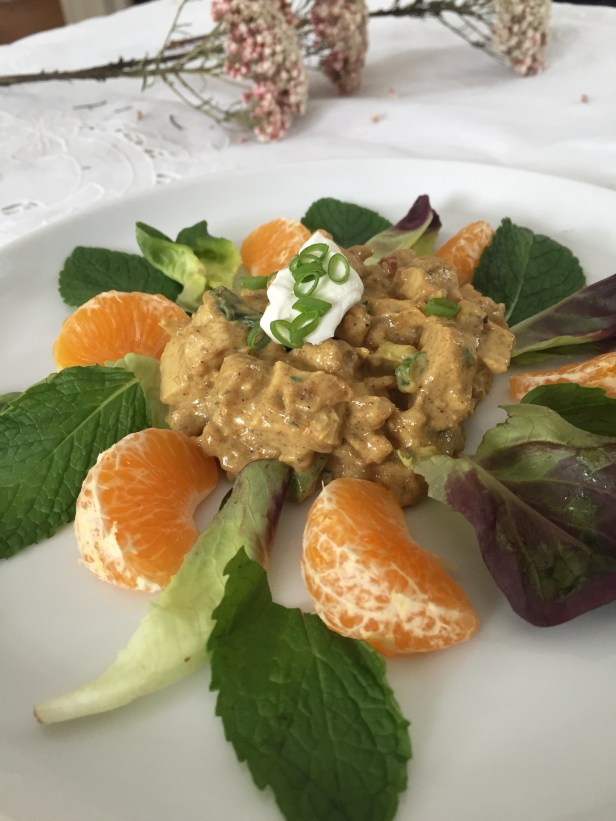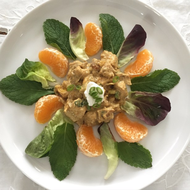 Tips: As above, to save time, use pre-cooked chicken or simplify the ‘bird’ marinade to salt, pepper and lime, and double the spices in the saute marinade. But never, never skip the sauteéing of the spices. This is mandatory to avoid the gritty taste and lack of aroma of uncooked spices. I used a part-ripe mango here for its piquancy. Feel free to use raisins and a small handful of sliced almonds, often bedfellows of the royal coronation chicken 🙂
